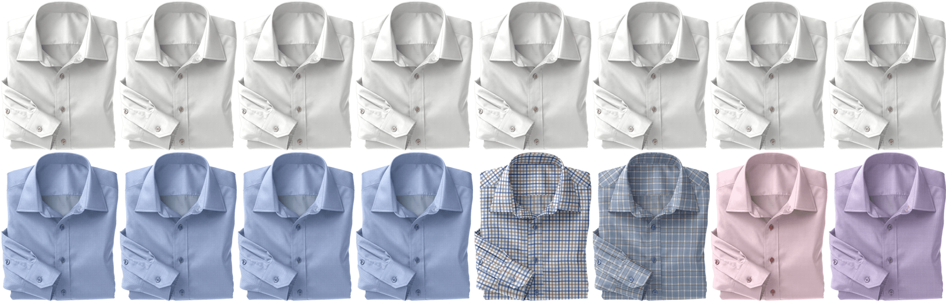 At its most basic, the formula for choosing shirts that make up the foundation or your wardrobe boils down to taking the number of days per week that you dress for work and multiply that number by 3. Half of these shirts will be white, and the rest will be a mix of blue, patterned, and "high colors". If you are so inclined, you can stop right here. You now have enough knowledge right now to make your life easier when shopping for shirts.